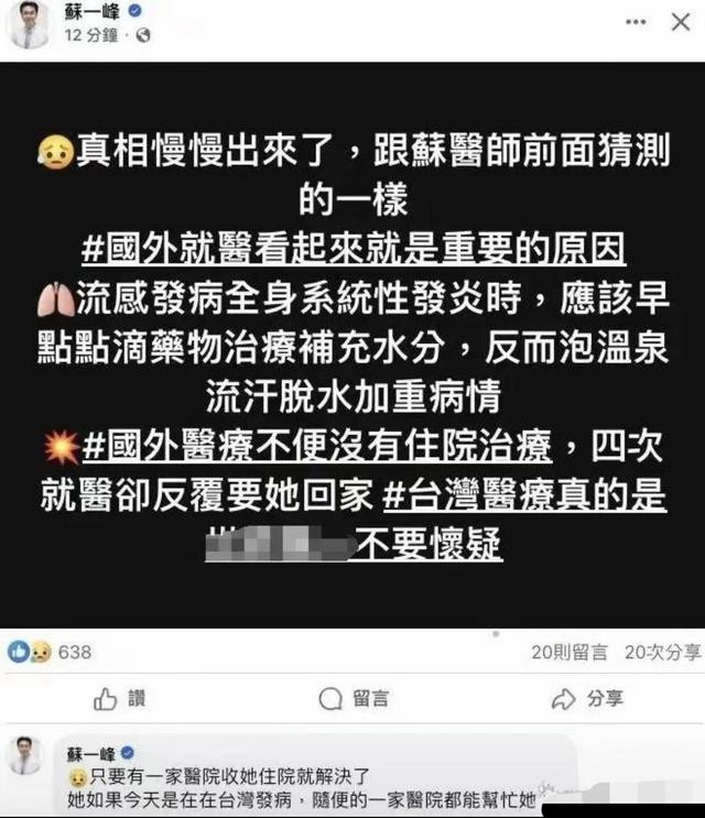 此外,医生还解释了大S为何没有住院治疗。原来,日本的医疗机构分级制度明确,乡下的医院医疗条件有限,很多复杂的病症无法处理。再加上日本人不太喜欢看外国病人,而且对外国病人的收费要比本地病人高百分之三百,这一系列因素都影响了大S的治疗进程。