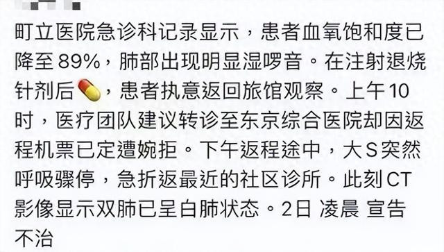 根据急诊就诊记录,大S被送到医院时,情况已经十分危急。她的血氧降到了89%,肺部出现明显湿啰音,医生见状迅速为其注射了退烧针剂药,然而最终还是没能挽回她的生命,大S不幸离世。这一消息曝光后,整个娱乐圈都沉浸在悲痛之中,众多艺人纷纷发文哀悼。